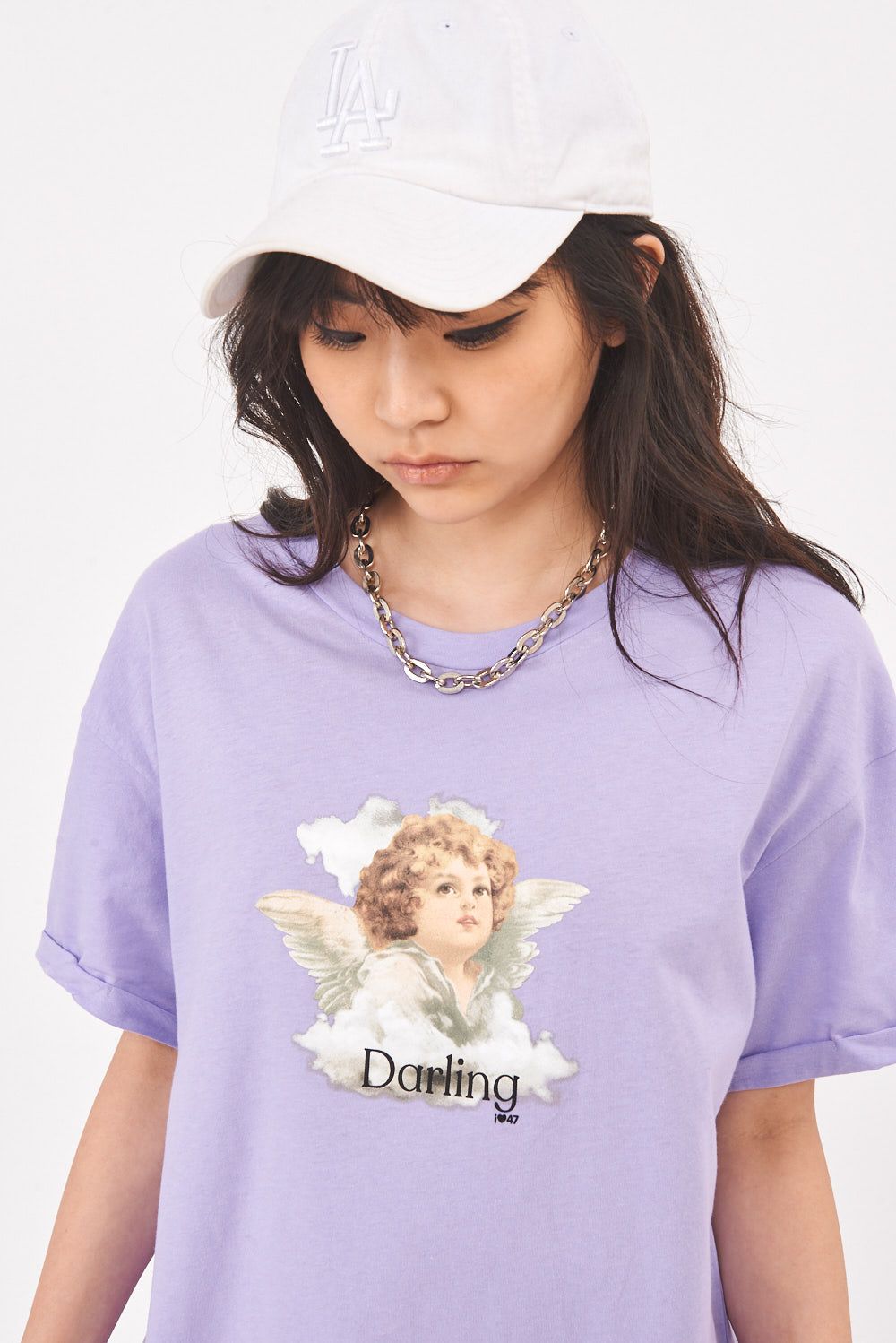 Remera de jersey cuello redondo manga corta. Cuello aplicado. Detalle de roll up en manga. Largo a la cadera. Estampa centrada en delantero.