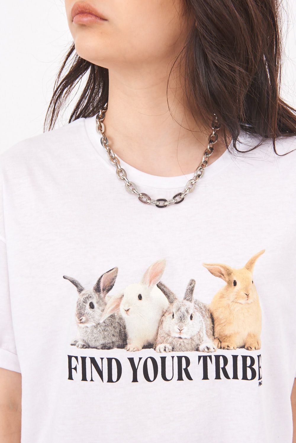Remera de jersey cuello redondo manga corta. Cuello aplicado. Detalle de roll up en manga. Largo a la cadera. Estampa centrada en delantero.